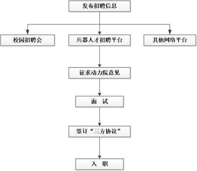 公司发布招聘信息,应聘者通过校园招聘会、“中国兵器人才招聘平台”及其他网络招聘平台投递个人简历,公司根据招聘需求进行简历筛选并征求“中国兵器工业集团动力研究院有限公司”意见,无异议后安排面试,面试通过,公司通知应聘者签订《高校毕业生就业协议》,确认入职时间并安排入职,做好入职体检、培训教育和住宿安排等工作。